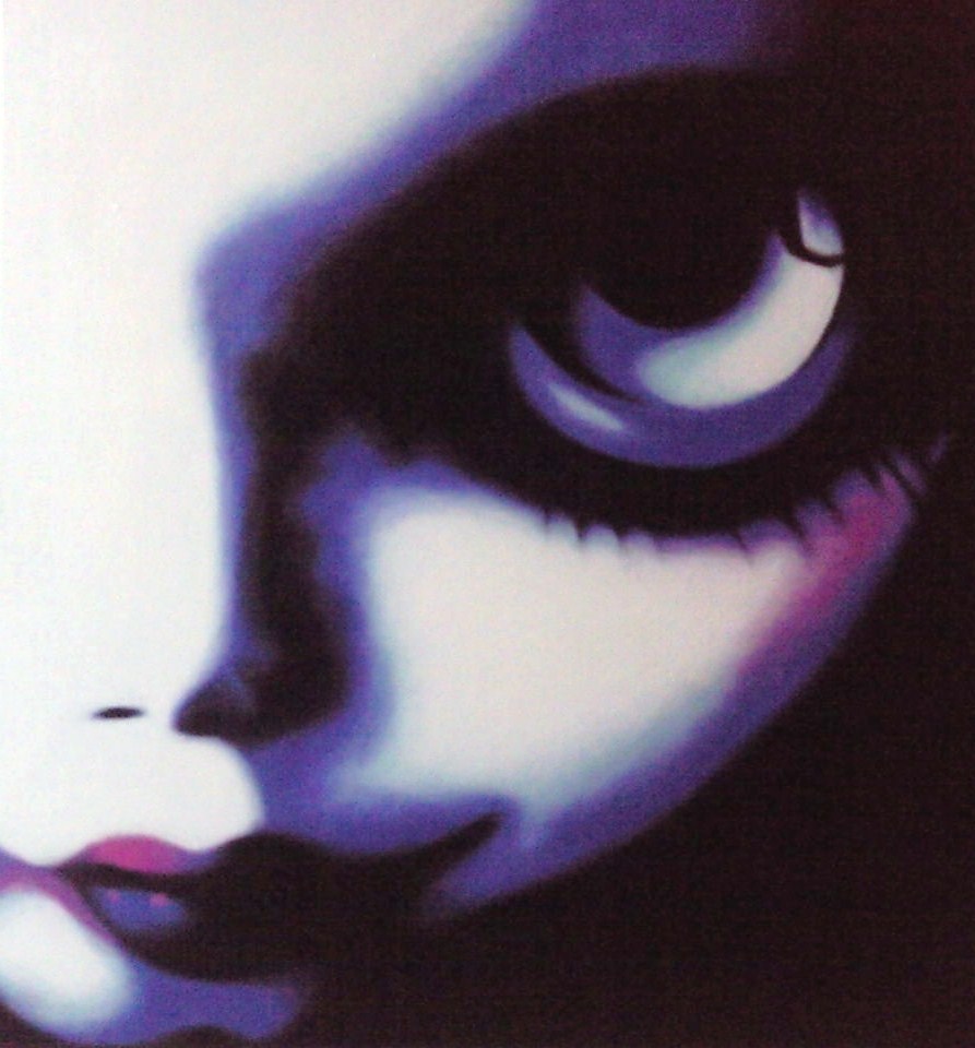 De gladde schildertechniek ondersteunt wat Miranda wil laten zien inhoudelijk Zij legt een verband met de maskerachtige make-up van geisha’s waarachter hun authentieke vrouwelijkheid verborgen blijft.