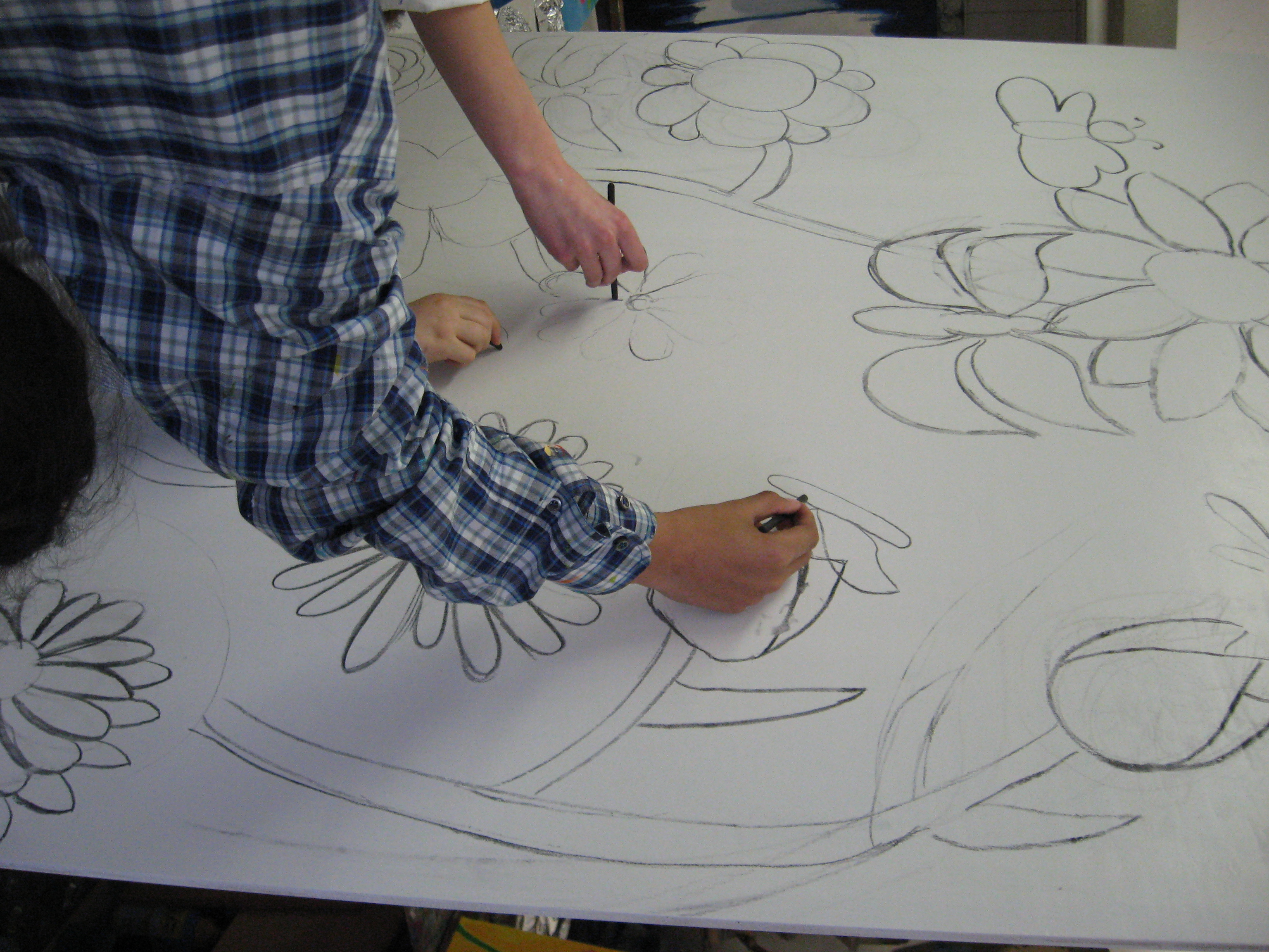 Daarna het grote bord(paneel) voor de KunstRotonde opzetten met houtskool.