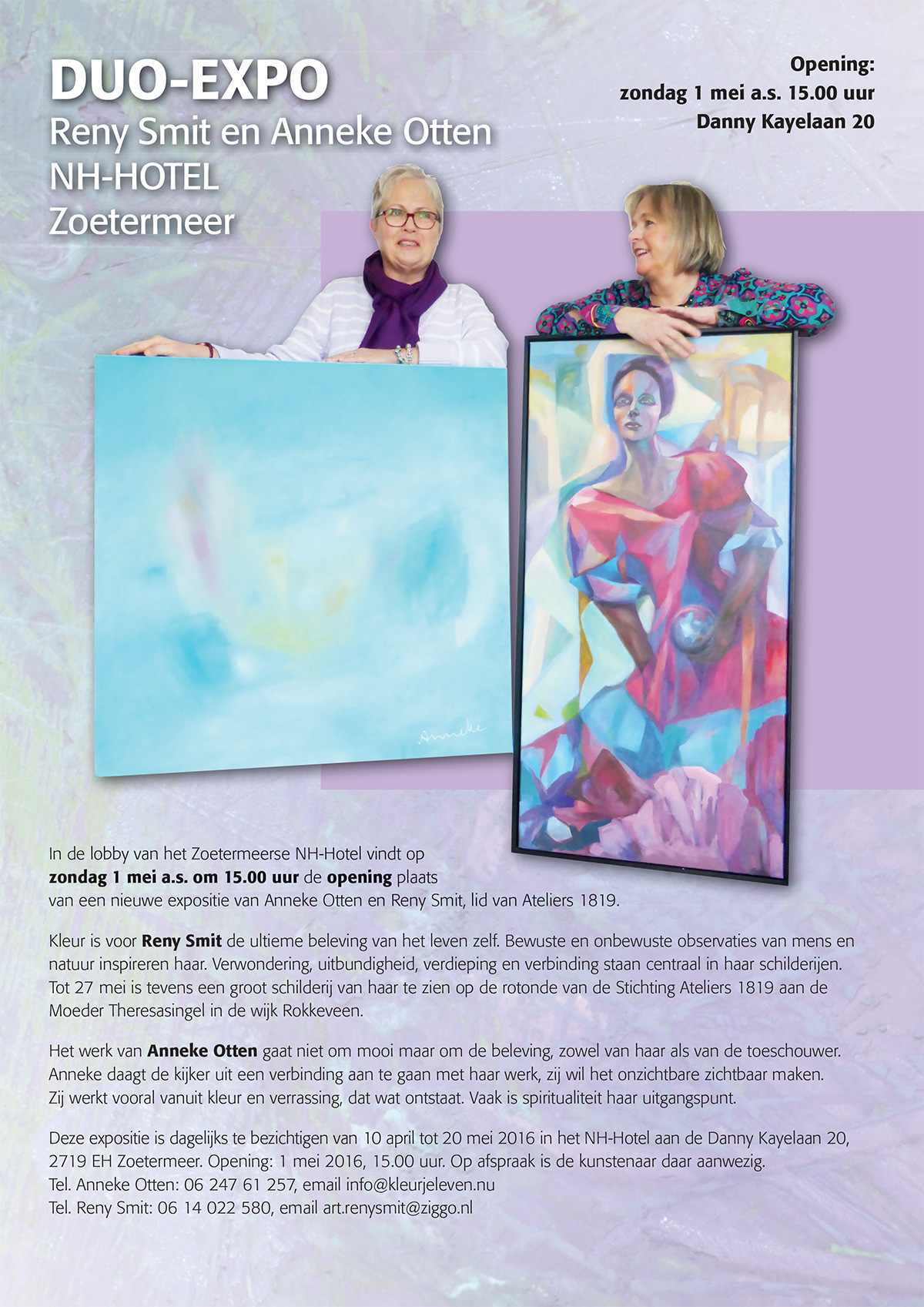 - Reny Smit: 06 14 022 580, email art.renysmit@ziggo.nl